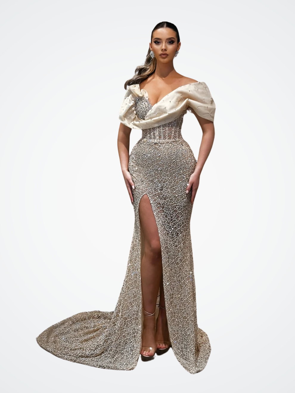 From the Gentiana Berisha Charm Collection, this exquisite wedding gown is meticulously crafted in our Kosovo atelier by skilled artisans. This piece features carefully selected premium fabrics and detailed handwork to create a truly unique bridal experience. This exclusive design embodies the elegant aesthetic that defines the Gentiana Berisha Charm collection.
